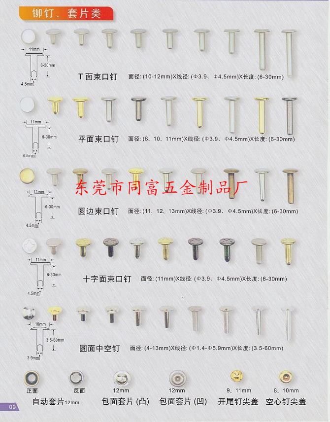 鞋類五金塑膠配件:雞眼、塑膠雞眼,腰形雞眼、鋁雞眼,空心釘、鉚釘、中空釘、線圈、鋅合金飾扣、登山扣、雙孔登山扣,虎骨扣;