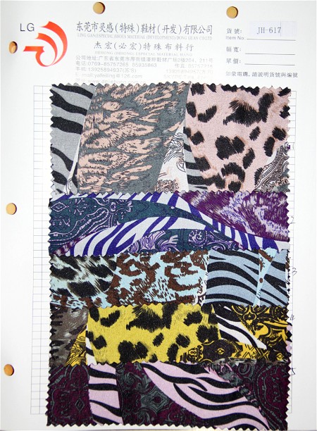 本產品屬于印花布系列特殊鞋材,結合豹點、斑馬紋印花而成,54''寬幅,五款顏色,歡迎選購。