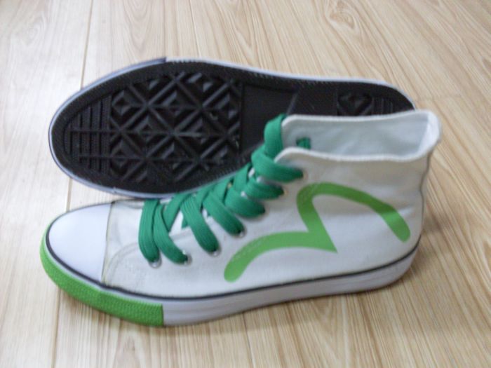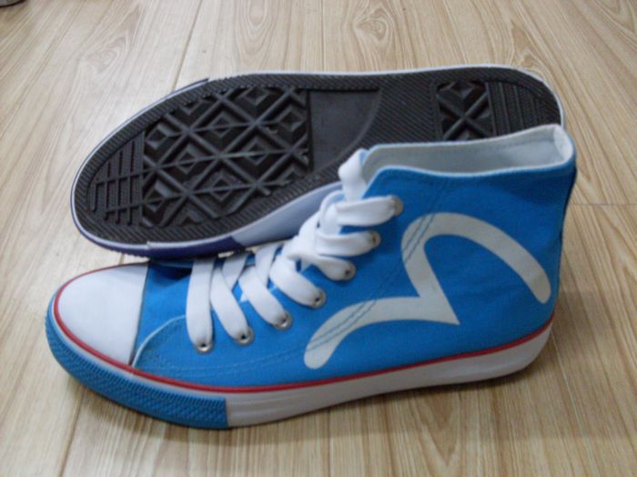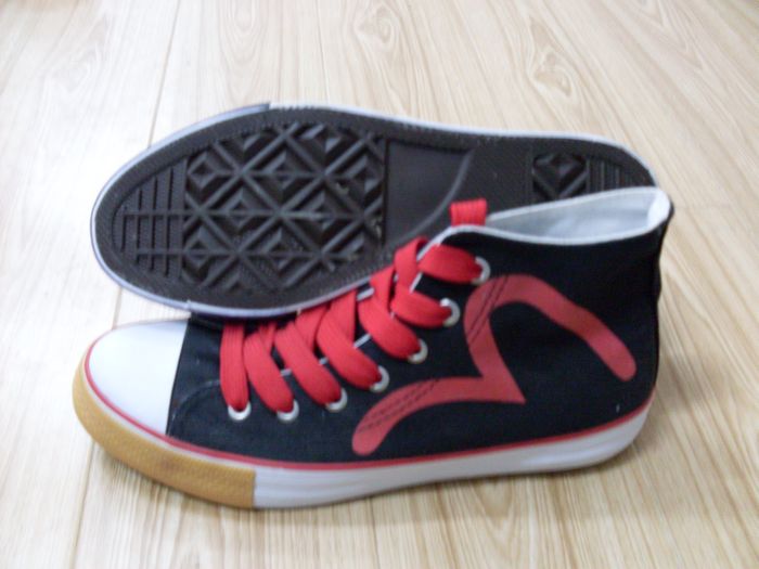 此款鞋為中幫硫化鞋、幫面有印花、大底材質為橡膠、八角棕色大底。