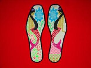 因我們的產(chǎn)品線料為滌淪線.故耐刷耐水洗;布料用純棉布,故吸水透氣性能極佳;在打底工藝上,有別于市面上的十字繡,故在結(jié)實(shí)度方面是其它產(chǎn)品所不能比擬的;每雙鞋墊約有15000個針腳凸起,可以對足部起到很好按摩的按摩作用以舒解疲勞;在人工上,一熟練繡娘至少需4天以上才完成一雙.特殊的工藝決定了工時.故此類產(chǎn)品定位較高檔;因產(chǎn)品的特性.決定了其價值和市場定位.因其舒適.透氣.時尚.耐用.又極具中國特色.觀賞、收藏、饋贈、實(shí)用價值更勝一籌!