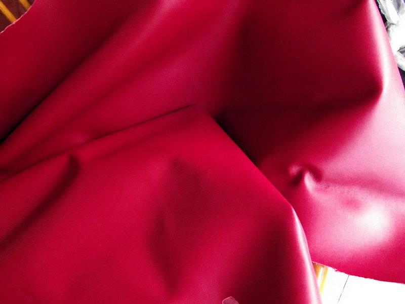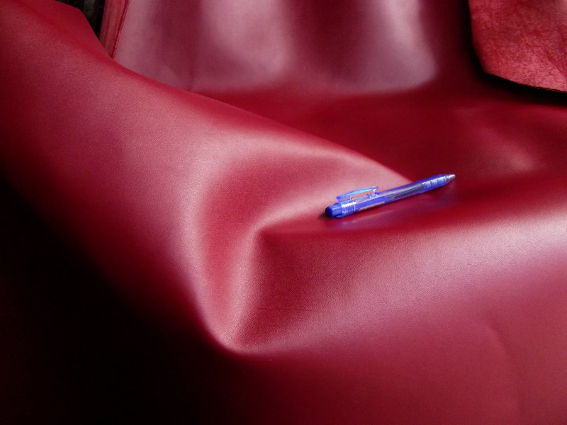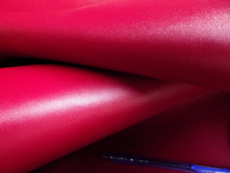 B100紋紅色二層干貼貼膜牛皮革,針孔紋,紋路均勻清晰可見,手感稍硬。