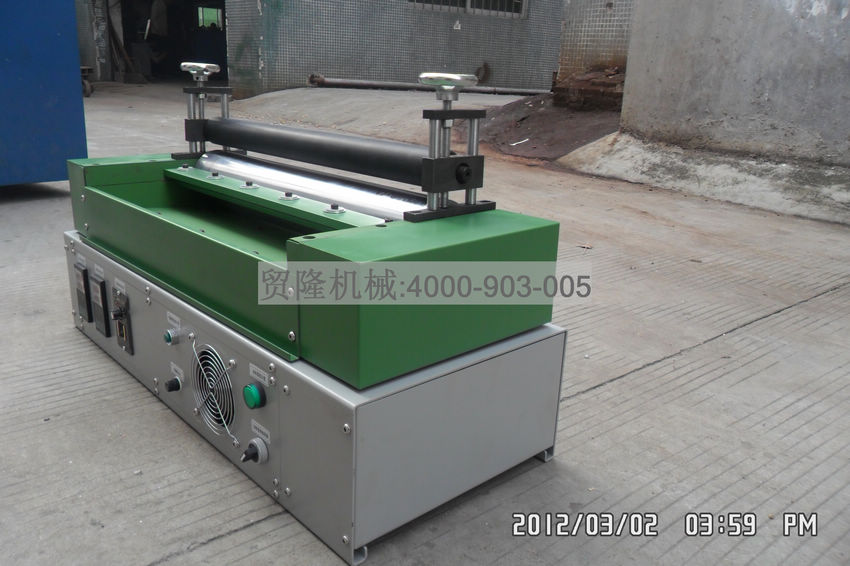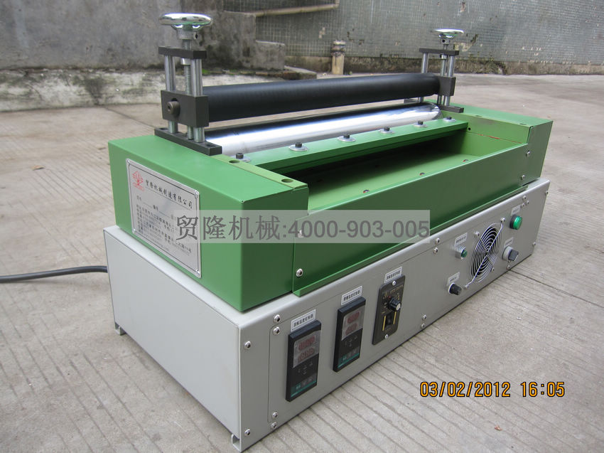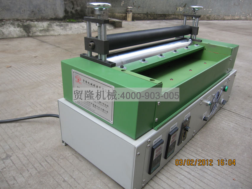 此熱熔膠機有二個滾筒,下滾筒粘滿熱熔膠,起涂膠的作用,上滾筒不會粘熱熔膠,起到對產品壓力的作用。