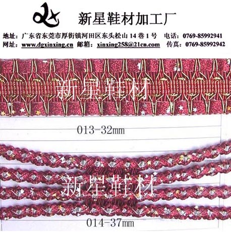 東莞新星織帶廠,主要生產:棉線,PU線,亮片,珠子,麻繩,金銀線等。時裝女鞋編織帶,時尚編織腰帶,及各種服飾花邊,玩具花邊等,特殊織帶。