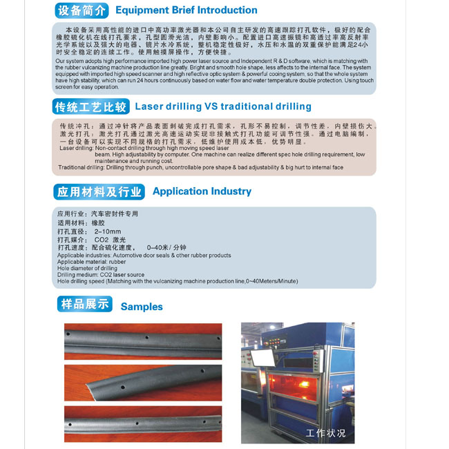 開泰激光全自動汽車門封條激光打孔機采用軟件控制系統及計算機接口智能模塊,選用國外先進的全封閉式CO2射頻激光管,高速數字掃描系統研制成的一種新型的在線式打孔設備。激光應用解決方案因具有明顯的低成本,可靠性和沒有消耗品而受到廣大客戶的青睞。 開泰激光作為工業先導提供全線激光應用解決方案以滿足眾多客戶的特殊要求。
