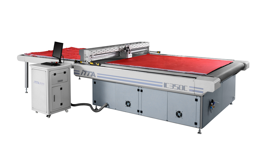 fabric cutting machine with conveyor is specially used for sample making and small-scale production, apply to clothing, automotive upholstery, sleeping beds, bags, shoes and hats, and other industries. The machine is suitable for PU, fabric, PVC, EVA cutting and sole, insole toe puffs cutting with pneumatic cutting head.