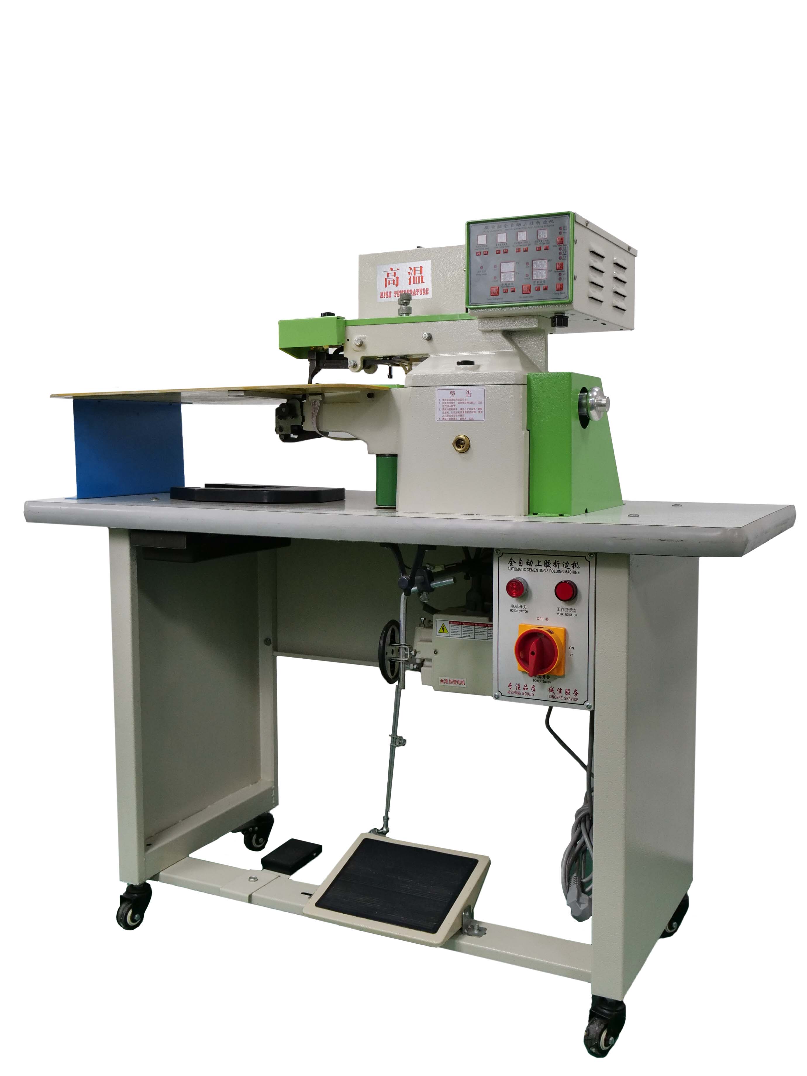 適用于高檔制鞋業,制包業,等皮制品的PVC,PU,天然皮,人造皮,帆布等材料,使用熱熔膠折邊作業。