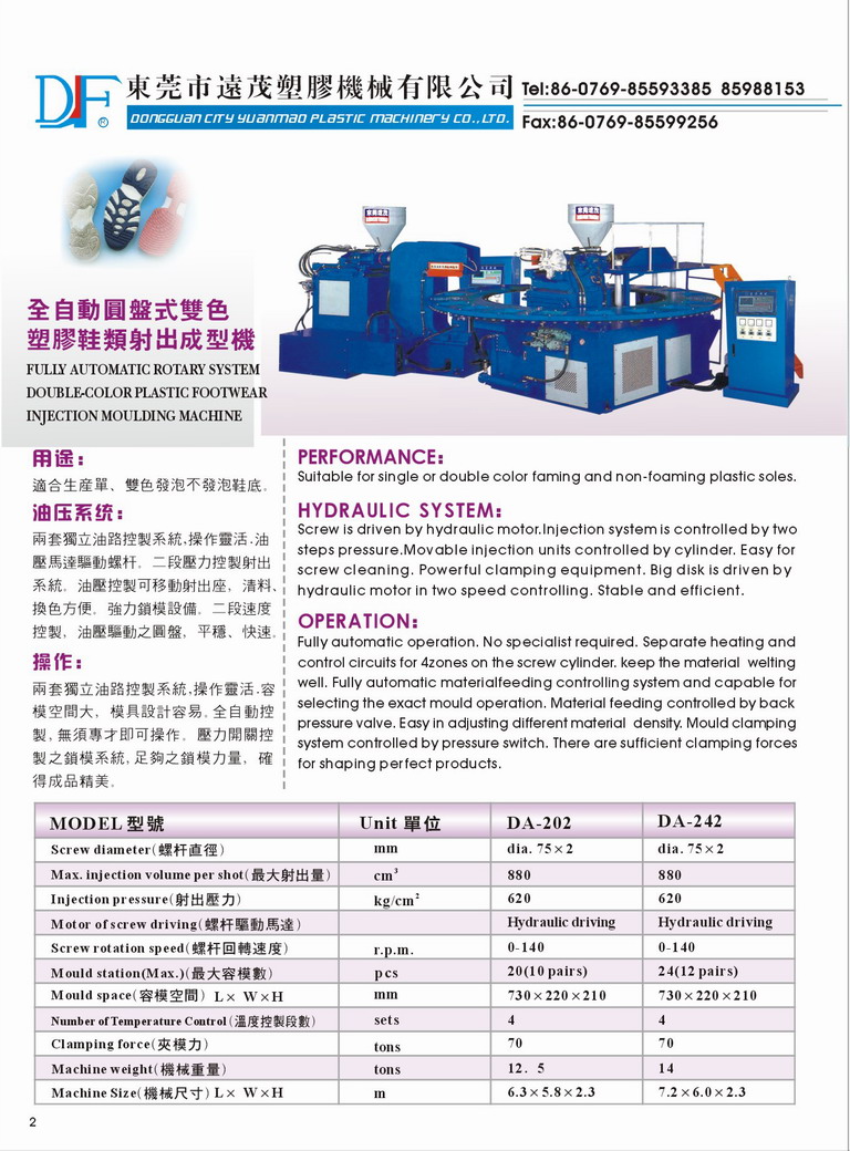本機(jī)是專用于生産單色、雙色發(fā)泡不發(fā)泡鞋底,是目前塑膠鞋類行業(yè)最理想的高效注射成型機(jī)。