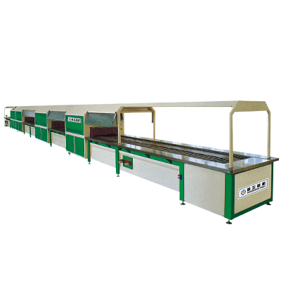 處理藥水烘干,采用熱風(fēng)循環(huán)烘道,第一次膠水烘干,第二溪膠水烘干,此系統(tǒng)亦適用水性膠,使鞋子能快速運至貼合壓低處。