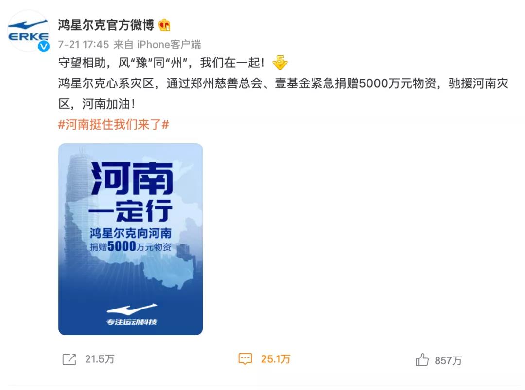 7月22日晚,話題 “鴻星爾克的微博評論好心酸” 突然爆上熱搜,讓這家近年低調至極的國貨品牌再次進入了大眾視野。原因是相比于各明星捐款熱搜,鴻星爾克在21日低調地宣布馳援河南洪水災區5000萬元物資,直到第二天才被網友發現。
