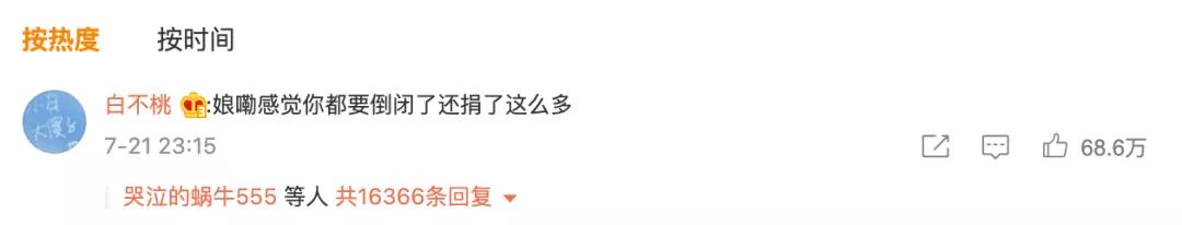 官微下面的評論區好笑又心酸,其中最火的一條評論是:“娘嘞感覺你都要倒閉了還捐了這么多”。