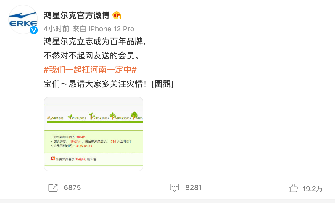 隨后,鴻星爾克官微發布:“鴻星爾克立志成為百年品牌,不然對不起網友送的會員。”