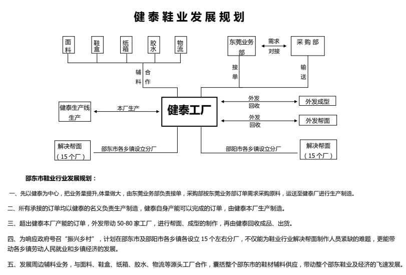 湖南健泰鞋業制造有限公司:創建于2018年4月,是邵東縣招商引資、承接產業轉移重點企業。位于湖南省中部、邵東縣火廠坪鎮工業園區,專業從事各類鞋產品研發、設計、制造與銷售。總投資8000萬元,廠區占地面積50000㎡,擁有六條具有國內外先進水平的自動化流水生產線,現有員工1000余人,其中高級技術人員30人。年產各類高檔鞋600多萬雙,年出口 1.5億美元。公司大力發展科技創新和技術研發,在東莞設立了產品研發部。2018年12月,公司通過國際 “BSCI人權”和“GSV反恐”兩大認證。擁有40多項國家專利,已邁向高新技術企業的行列。公司先后獲得“中國對 外援助培訓-湖南實訓基地”、“2018邵陽市民營企業100強”等榮譽稱號。