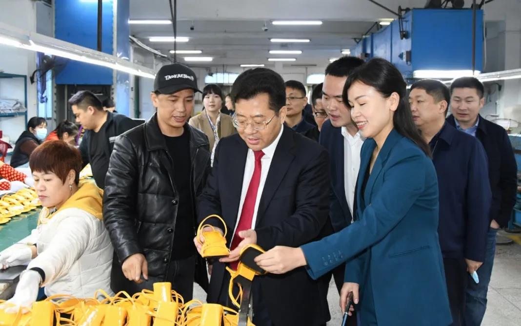 在惠州市鑫陽鞋業有限公司,賀朝暉一行參觀了生產車間、產品展示廳及辦公區,詳細了解了企業生產經營及未來產業發展規劃等情況。
