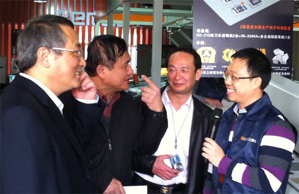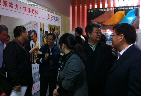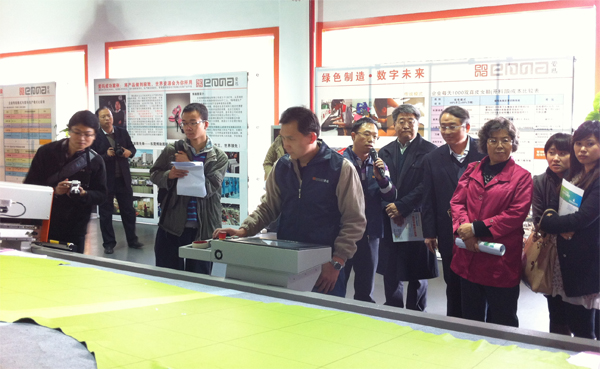 貴賓們興致勃勃地觀看了亞洲第一臺應用于皮具手袋、制鞋等行業的雙刀頭平板式電腦皮革切割機演示,觀看了應用于時尚產業輔助設計及生產的愛瑪電腦全自動釘扣機演示,參觀了愛瑪全球技術服務中心,在觀看三維足部激光掃描機時,有貴賓忍不住抬腳測量……在亞洲第一臺應用于軟體家具及汽車座套和內飾的大型電腦皮革切割設備前,王總向貴賓們詳細介紹了手工裁剪與愛瑪模式的區別,并向貴賓們展示了傳統生產工具。