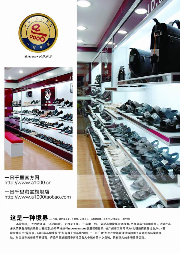 不聚細流,無以成汪洋,不積畦步,無以至千里。十年磨一劍,成功品牌需要點滴積累。歷經多年的打造與磨練,“一日千里”多次榮獲各類鞋類設計大賽獎章。身為“廣東男鞋十強品牌”之一,“心定·神馳 一日千里”的品牌理念,早已滲透至華南地區的各大中小城市。