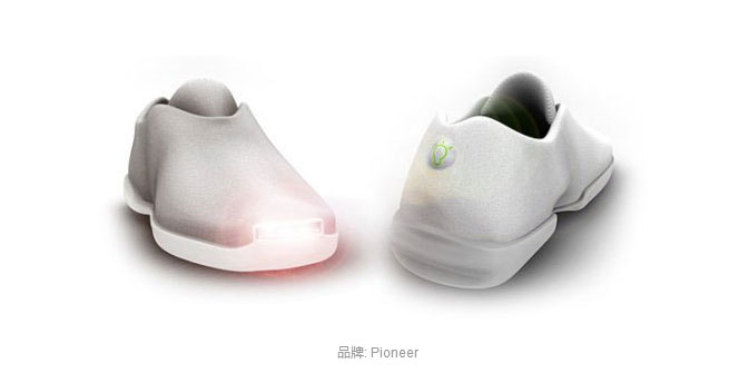 先鋒電子(Pioneer)推出的這雙鞋(下圖)就像前后都安了手電筒一樣,簡直是黑夜中行走的利器!它的前燈可以照亮最多1.5的距離。鞋子后部的LED綠燈則可以讓車輛注意到行人。而這雙鞋最棒的部分是,它可以把運動產生的能量轉化為電能,自行供電。