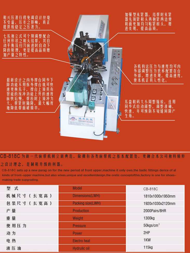 “誠本鞋機”座落于風景秀麗的東海之濱,美麗的浙南鞋都——瑞安。我公司是一家專業從事鞋機制造銷售的新型企業。主要產品有制鞋流水線、烘箱、前幫機、后幫機、冷熱制定型機、三色和條機、和條壓型機等成套橡膠設備。“誠本鞋機”秉承“以顧客為核心,以市場為先導”的經營理念;導入國際先進的制作技術,結合當前不斷變化的客戶需求,積極吸取國內外先進的技術和管理人才,不斷創新,并建立了健全的售后服務體系和質量保證體系,努力融入人性化設計,在同行中脫穎而出。全面提升企業的創造能力、行銷能力、設計能力,形成企業飛速發展趨勢,乘風破浪、領航未來!
