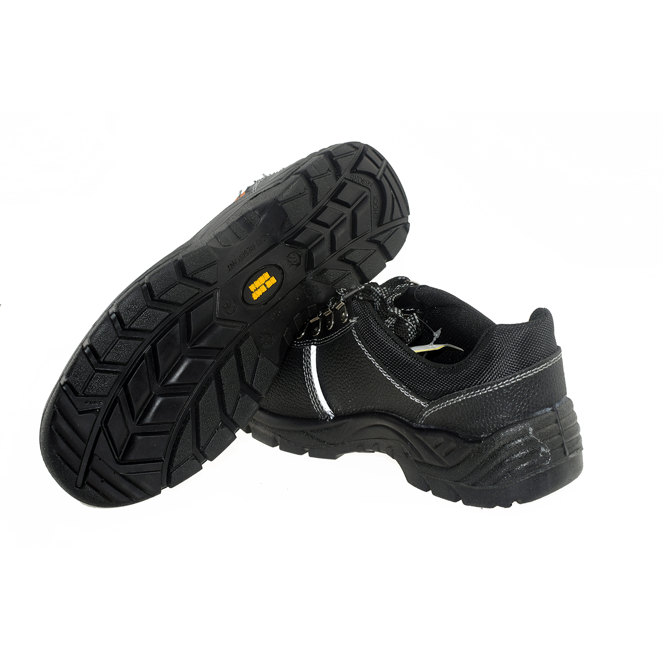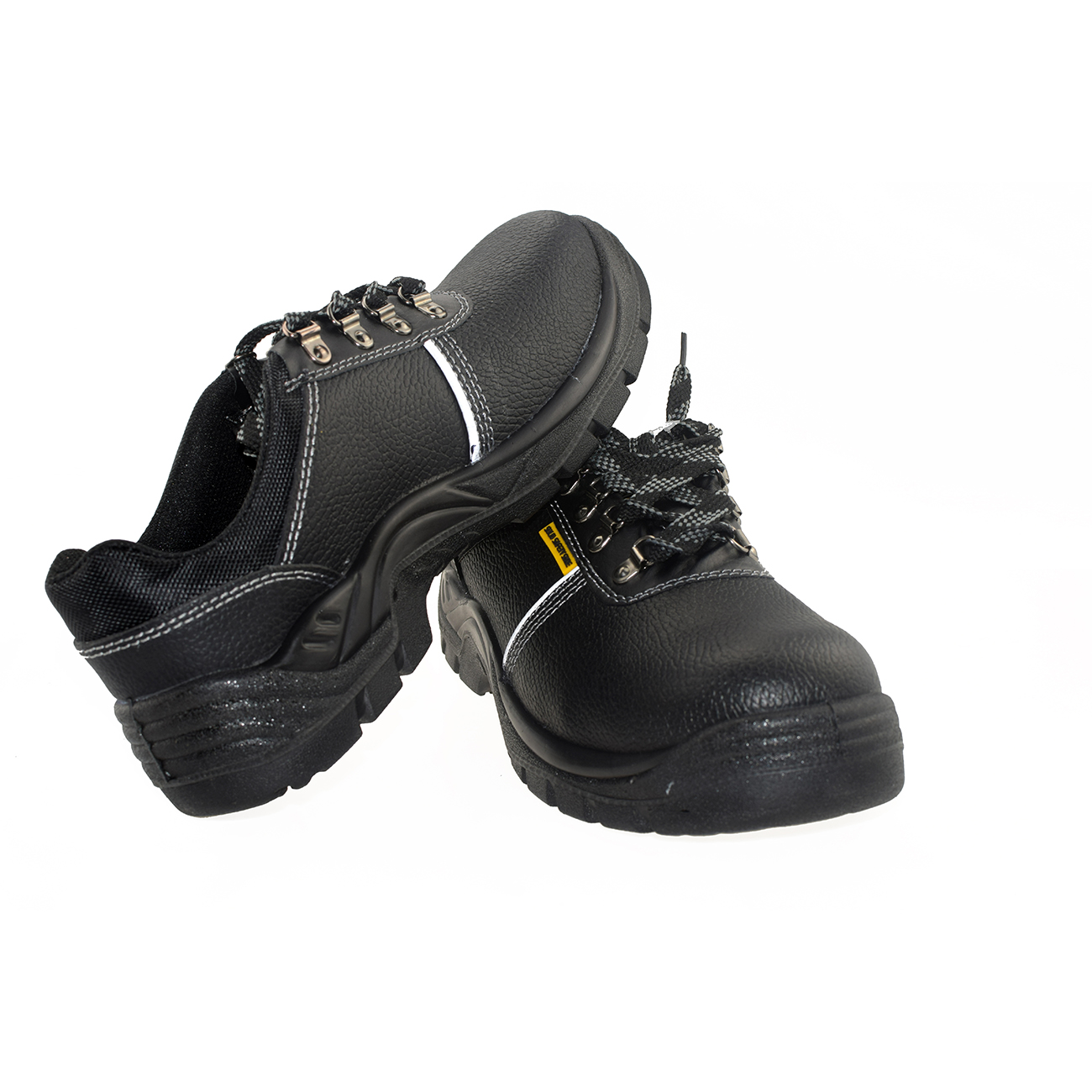鞋面 優質二層壓花水牛皮,兩側警示反光條,防塵鞋舌,有效防止塵渣進入,同時兼具防潑水功能